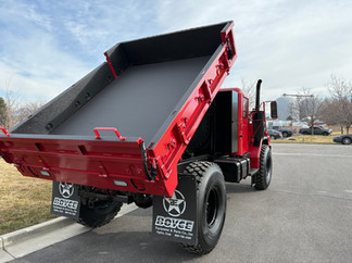Fiberglass Hard w/Sliding Rear window, Power Steering, LED Lighting Upgrade, 900 Series storage box (INstalled in place of stock spare tire rack, Custom locker box installed behind passenger side of cab, A/C- Above Head install, Air Ride seats installed on both driver and passenger side, Extra cable style steps added, Rear Trailer Hitch w/ 7 Pin 12V Hook-Up, Block Heater, ARB Air Locker installed in Front Axle and rear axle, Boyce Lock Out Hubs, On/Off Keyed switch, 60 amp reducer, 80 amp Upgraded Alternator, custom 5 ton 10' bed, Dump Hoist added, New 14.00R20 tires w/matching spare tire/wheel, LineX Bedlined bed/Bumper, 18K Electric winch w/synthetic rope, a3 to a2 axle swap, and added the red w/Black Paint scheme. Love how this truck started out red and ended red. Another great Looking Boyce Built truck.